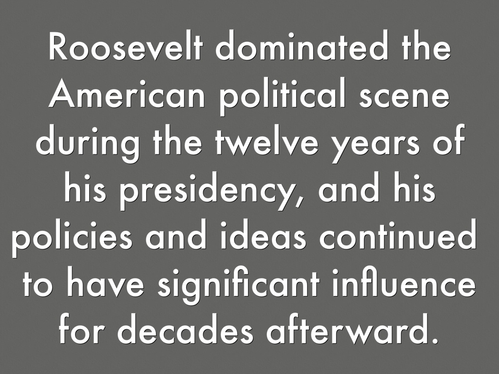 Roosevelt dominated the American political scene during the twelve years of his presidency, and his policies and ideas continued to have significant influence for decades afterward.