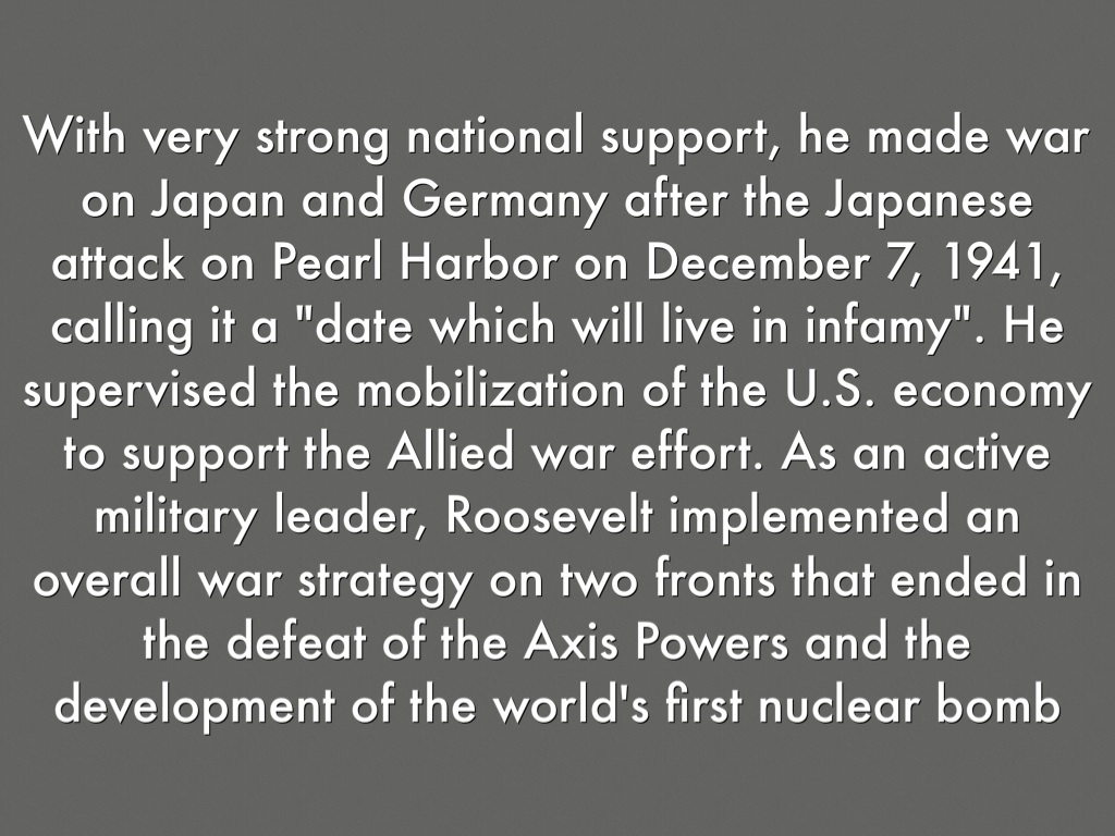 With very strong national support, he made war on Japan and Germany after the Japanese attack on Pearl Harbor on December 7, 1941, calling it a "date which will live in infamy". He supervised the mobilization of the U.S. economy to support the Allied war effort. As an active military leader, Roosevelt implemented an overall war strategy on two fronts that ended in the defeat of the Axis Powers and the development of the world's first nuclear bomb