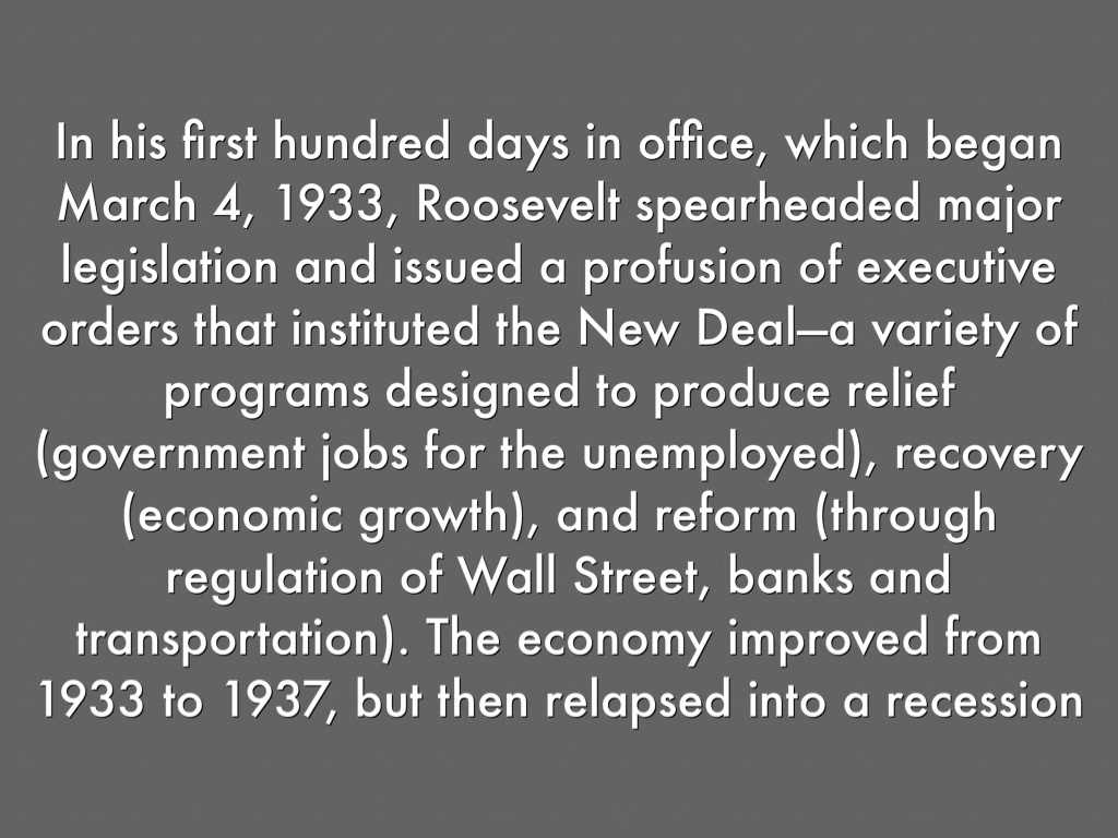 In his first hundred days in office, which began March 4, 1933, Roosevelt spearheaded major legislation and issued a profusion of executive orders that instituted the New Deal—a variety of programs designed to produce relief (government jobs for the unemployed), recovery (economic growth), and reform (through regulation of Wall Street, banks and transportation). The economy improved from 1933 to 1937, but then relapsed into a recession