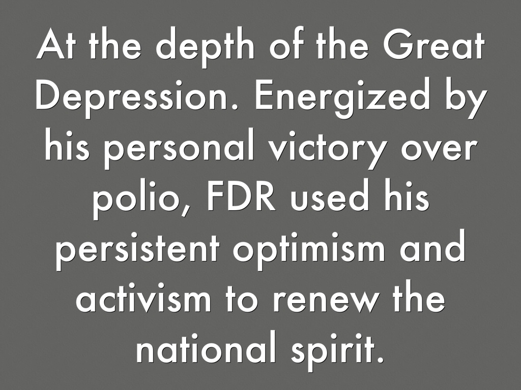 At the depth of the Great Depression. Energized by his personal victory over polio, FDR used his persistent optimism and activism to renew the national spirit.
