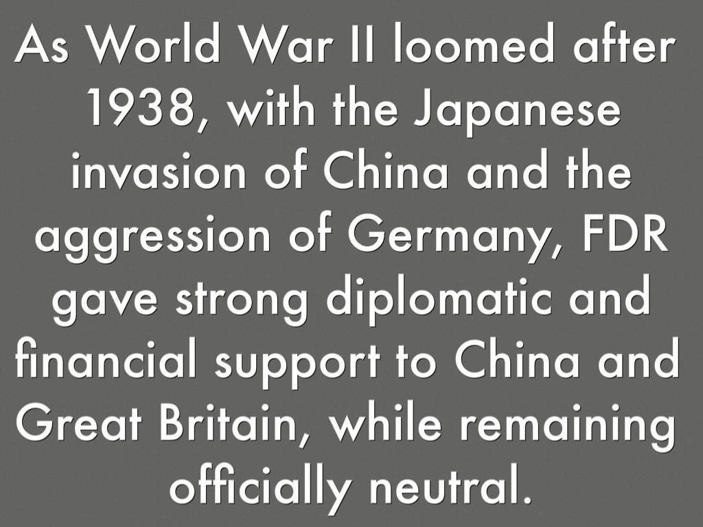 As World War II loomed after 1938, with the Japanese invasion of China and the aggression of Germany, FDR gave strong diplomatic and financial support to China and Great Britain, while remaining officially neutral.