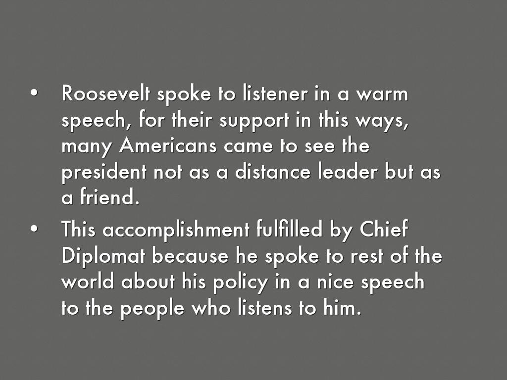 • Roosevelt spoke to listener in a warm speech, for their support in this ways, many Americans came to see the president not as a distance leader but as a friend.