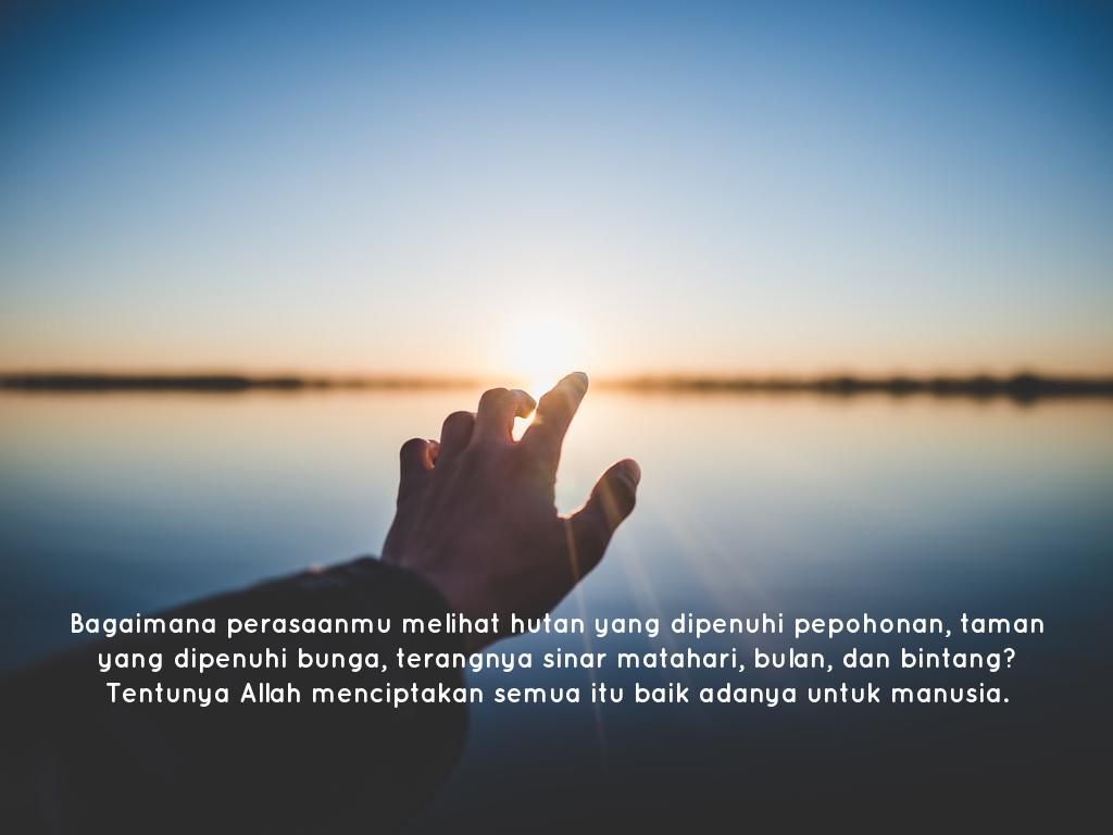 Bagaimana perasaanmu melihat hutan yang dipenuhi pepohonan, taman yang dipenuhi bunga, terangnya sinar matahari, bulan, dan bintang? Tentunya Allah menciptakan semua itu baik adanya untuk manusia.