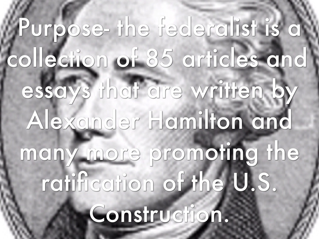 Purpose- the federalist is a collection of 85 articles and essays that are written by Alexander Hamilton and many more promoting the ratification of the U.S. Construction.