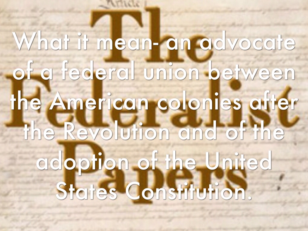 What it mean- an advocate of a federal union between the American colonies after the Revolution and of the adoption of the United States Constitution.