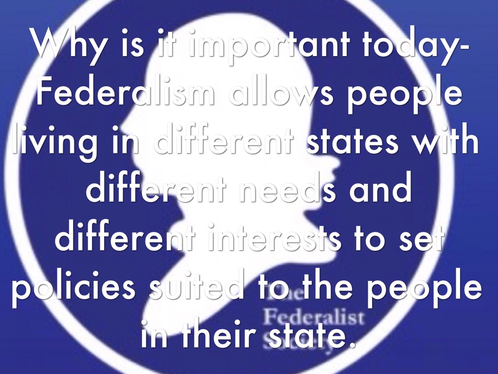 Why is it important today- Federalism allows people living in different states with different needs and different interests to set policies suited to the people in their state.