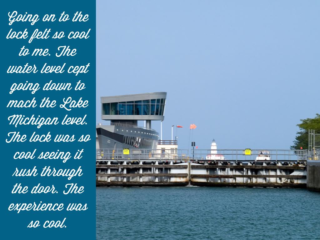 Going on to the lock felt so cool to me. The water level cept going down to mach the Lake Michigan level. The lock was so cool seeing it rush through the door. The experience was so cool.