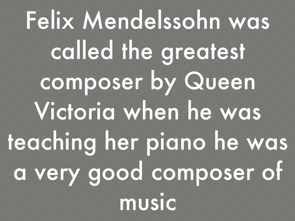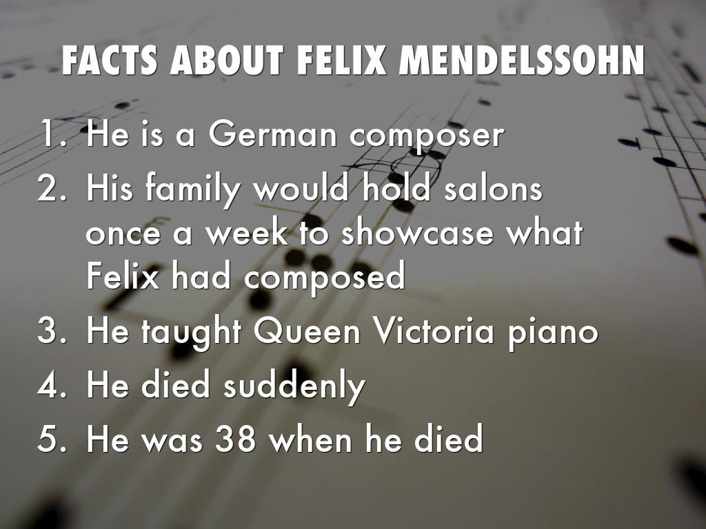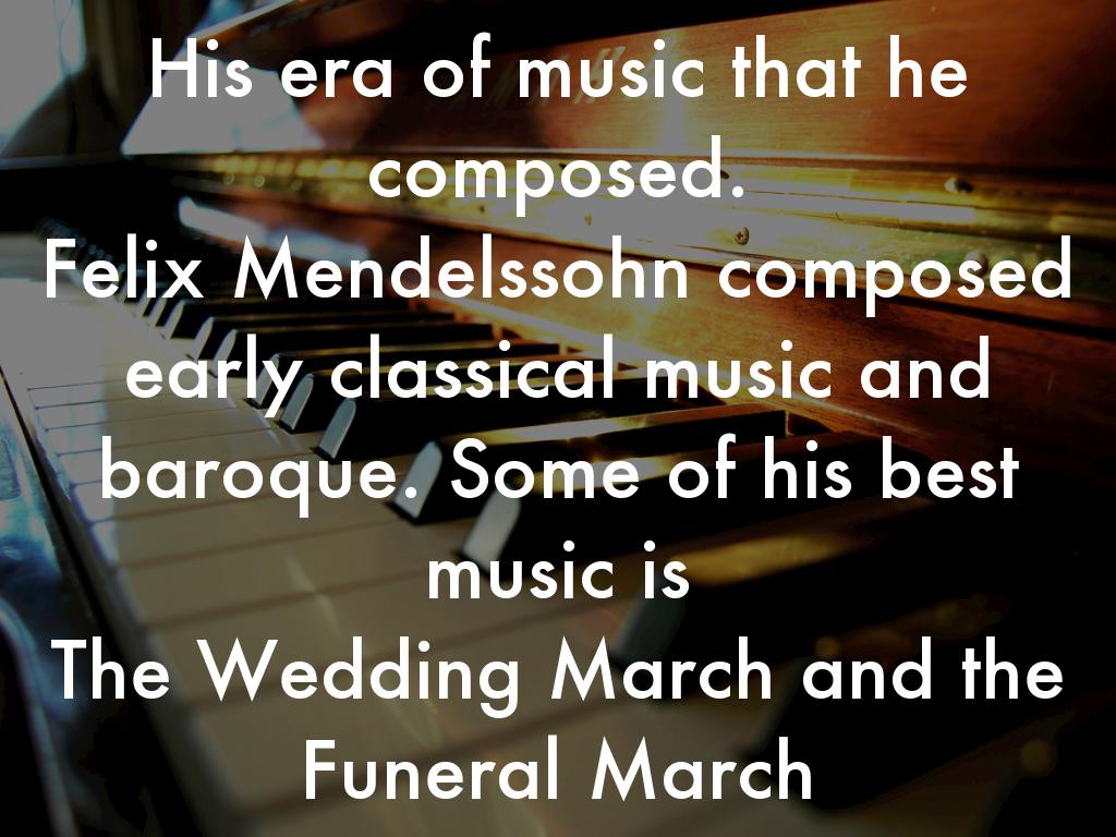 His era of music that he composed. Felix Mendelssohn composed early classical music and baroque. Some of his best music is The Wedding March and the Funeral March