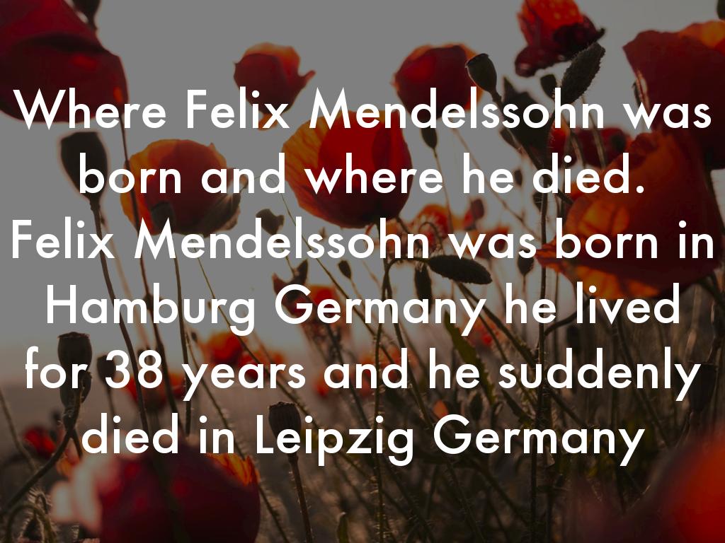 Where Felix Mendelssohn was born and where he died. Felix Mendelssohn was born in Hamburg Germany he lived for 38 years and he suddenly died in Leipzig Germany