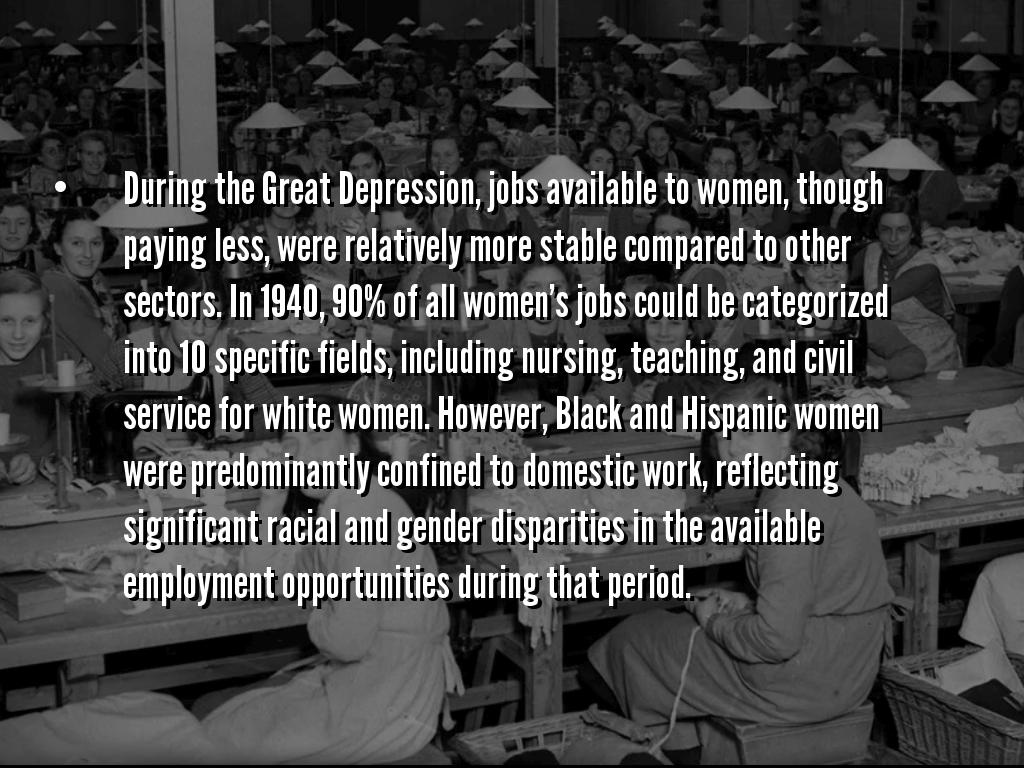 • During the Great Depression, jobs available to women, though paying less, were relatively more stable compared to other sectors. In 1940, 90% of all women's jobs could be categorized into 10 specific fields, including nursing, teaching, and civil service for white women. However, Black and Hispanic women were predominantly confined to domestic work, reflecting significant racial and gender disparities in the available employment opportunities during that period.