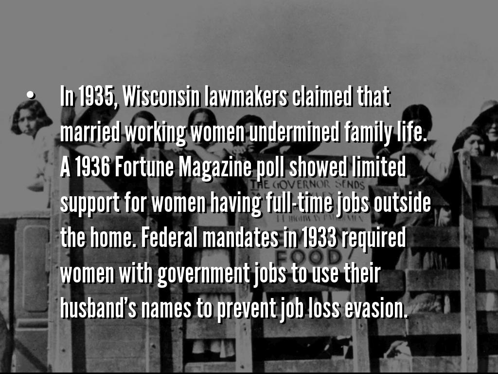 • In 1935, Wisconsin lawmakers claimed that married working women undermined family life. A 1936 Fortune Magazine poll showed limited support for women having full-time jobs outside the home. Federal mandates in 1933 required women with government jobs to use their husband's names to prevent job loss evasion.