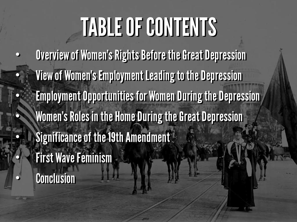 In conclusion, the exploration of feminism in the early twentieth century unveils a transformative period marked by significant milestones and enduring challenges. Despite facing societal opposition and legislative hurdles, the women's suffrage movement persevered. The Great Depression brought forth new challenges, revealing discrimination in the workforce and societal expectations. The 19th Amendment and the first wave of feminism collectively empowered women, allowing them to actively participate in shaping their futures. As we reflect on this era, let us acknowledge the resilience, determination, and collective strength of the women who paved the way. Their legacy endures, inspiring continued efforts toward a more inclusive and equitable society.