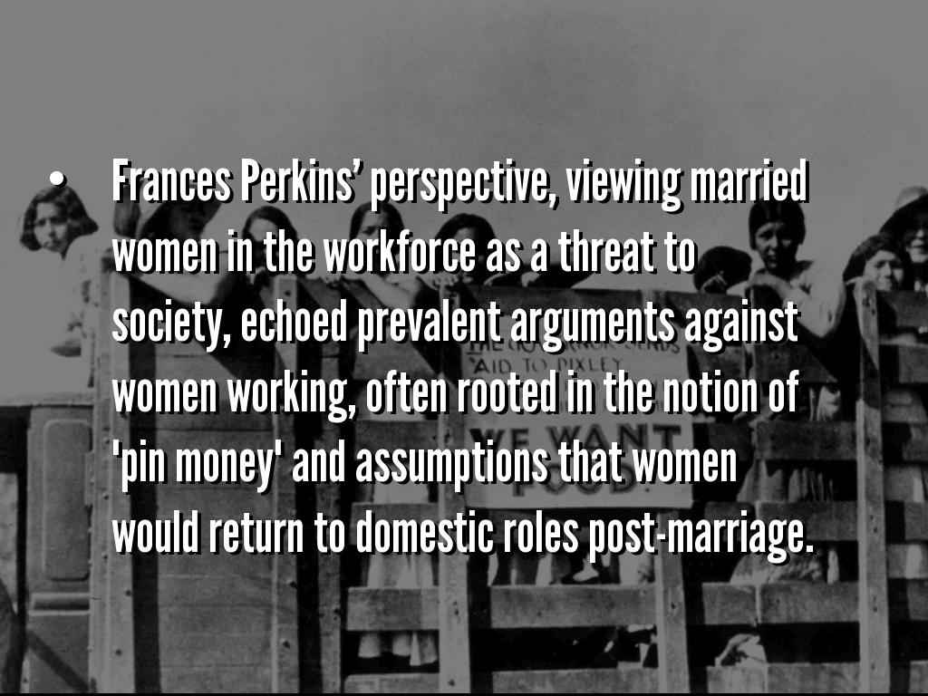 • Frances Perkins' perspective, viewing married women in the workforce as a threat to society, echoed prevalent arguments against women working, often rooted in the notion of "pin money" and assumptions that women would return to domestic roles post-marriage.