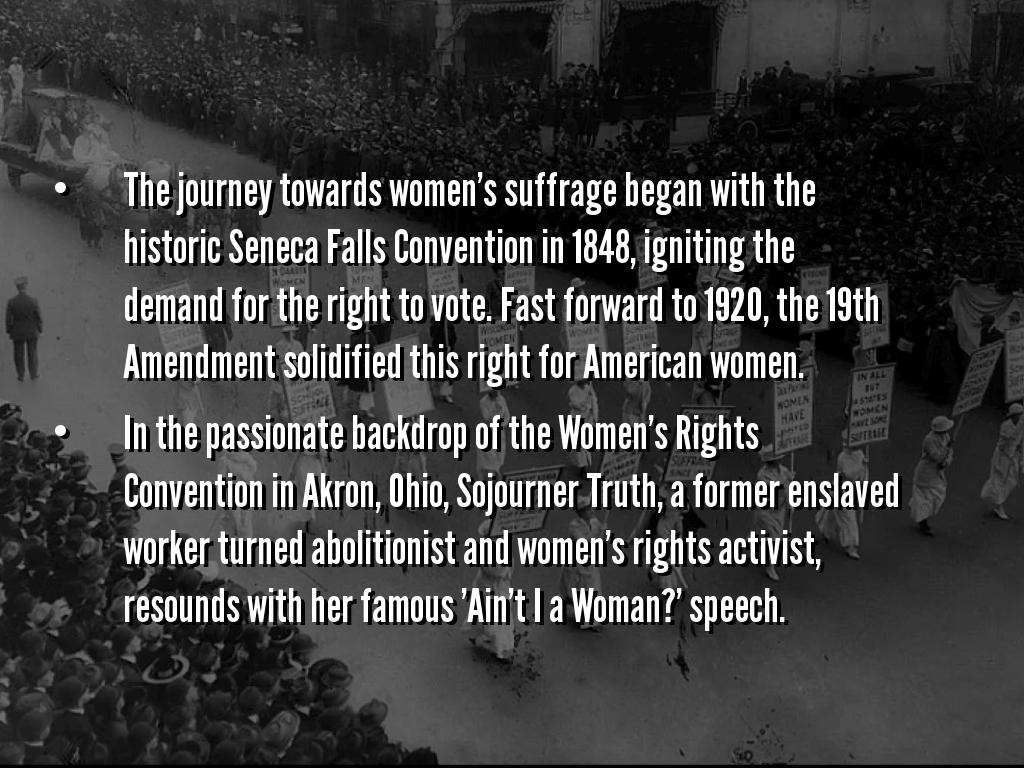 • The journey towards women's suffrage began with the historic Seneca Falls Convention in 1848, igniting the demand for the right to vote. Fast forward to 1920, the 19th Amendment solidified this right for American women.