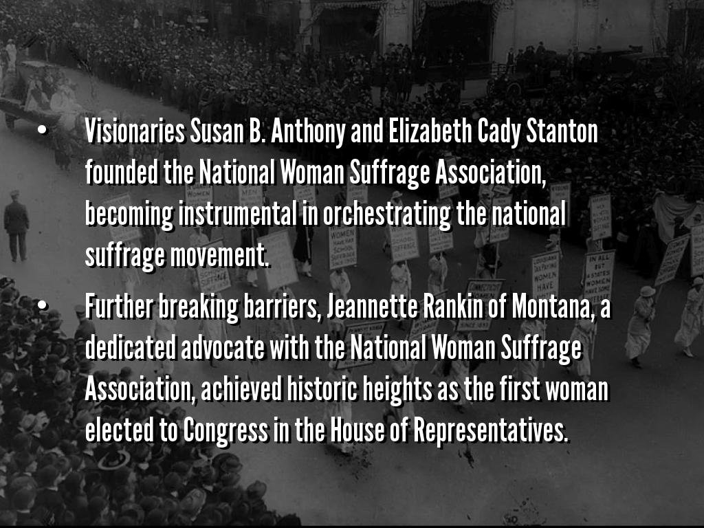 • Visionaries Susan B. Anthony and Elizabeth Cady Stanton founded the National Woman Suffrage Association, becoming instrumental in orchestrating the national suffrage movement.