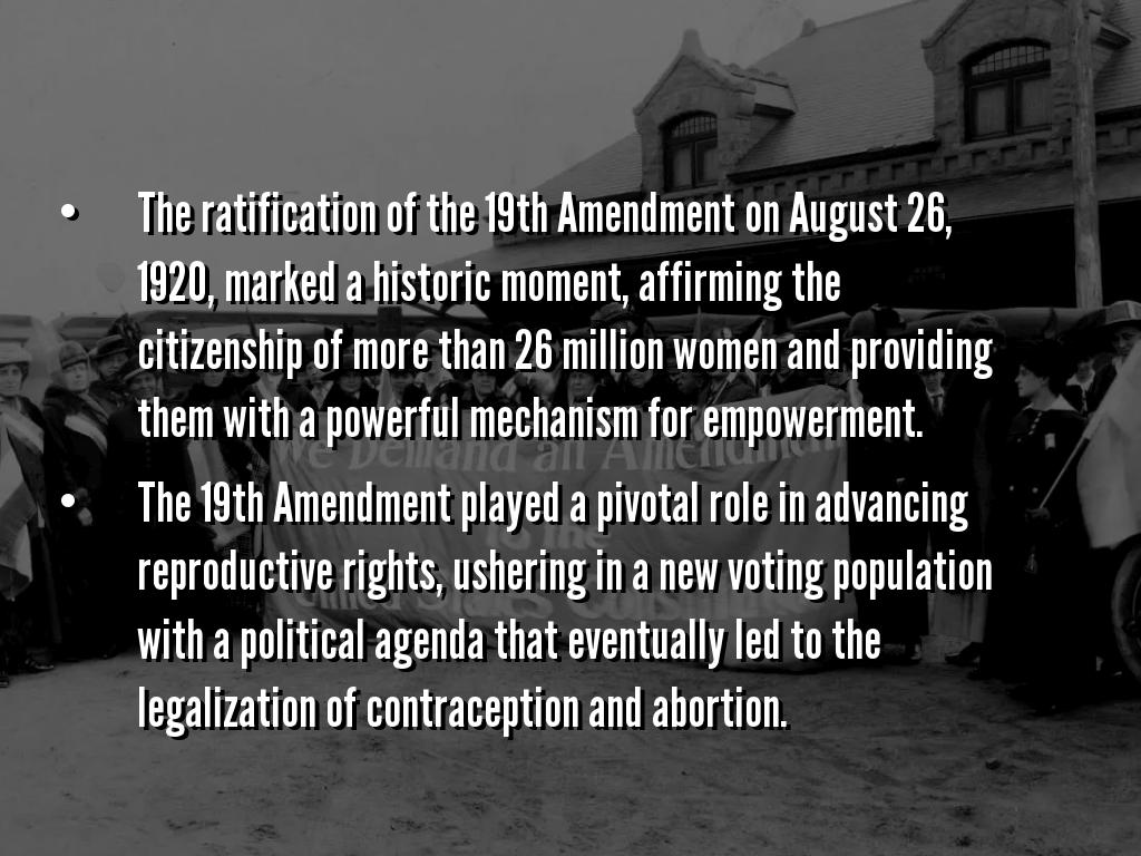 • The 19th Amendment played a pivotal role in advancing reproductive rights, ushering in a new voting population with a political agenda that eventually led to the legalization of contraception and abortion.