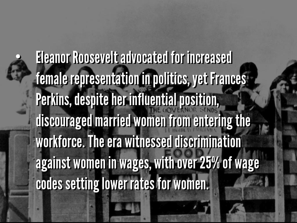 • Eleanor Roosevelt advocated for increased female representation in politics, yet Frances Perkins, despite her influential position, discouraged married women from entering the workforce. The era witnessed discrimination against women in wages, with over 25% of wage codes setting lower rates for women.