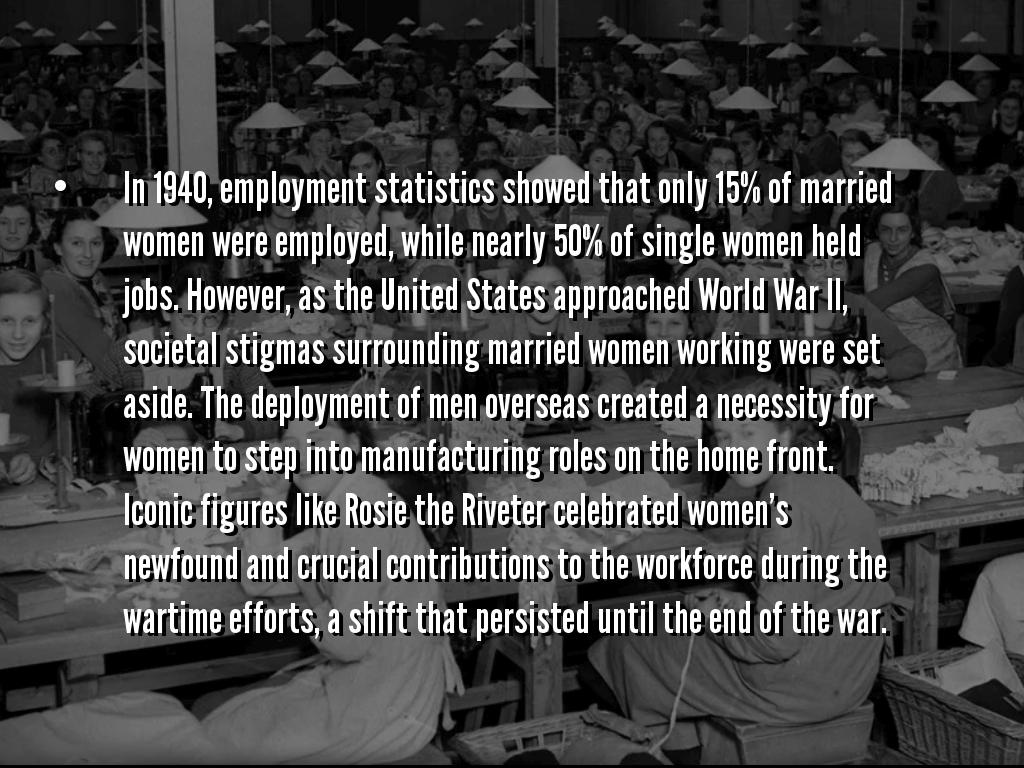 • In 1940, employment statistics showed that only 15% of married women were employed, while nearly 50% of single women held jobs. However, as the United States approached World War II, societal stigmas surrounding married women working were set aside. The deployment of men overseas created a necessity for women to step into manufacturing roles on the home front. Iconic figures like Rosie the Riveter celebrated women's newfound and crucial contributions to the workforce during the wartime efforts, a shift that persisted until the end of the war.