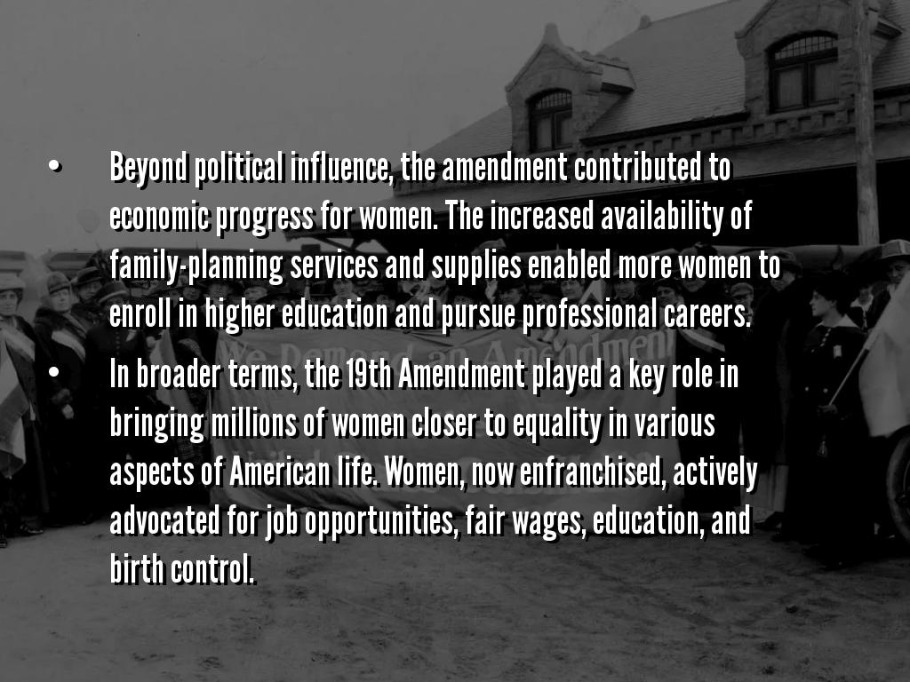 • Beyond political influence, the amendment contributed to economic progress for women. The increased availability of family-planning services and supplies enabled more women to enroll in higher education and pursue professional careers.