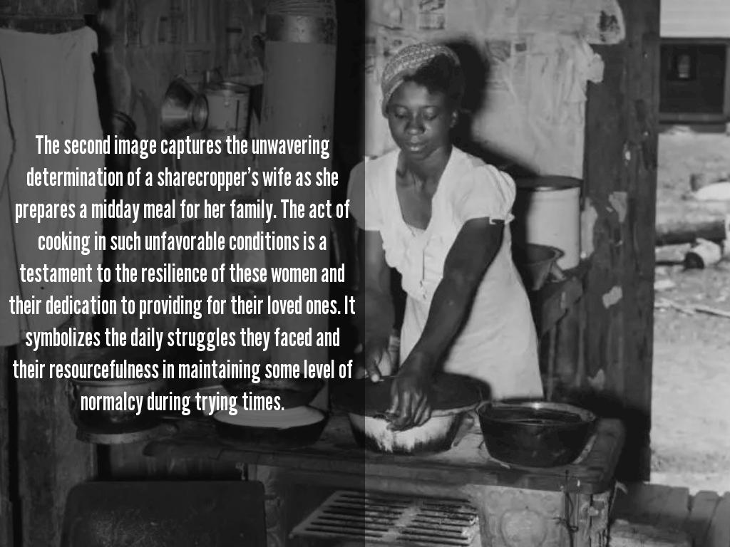 The second image captures the unwavering determination of a sharecropper's wife as she prepares a midday meal for her family. The act of cooking in such unfavorable conditions is a testament to the resilience of these women and their dedication to providing for their loved ones. It symbolizes the daily struggles they faced and their resourcefulness in maintaining some level of normalcy during trying times.