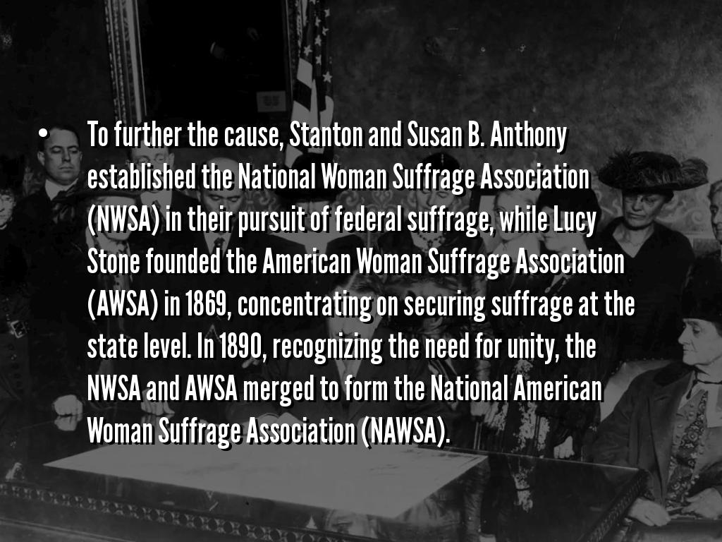 • To further the cause, Stanton and Susan B. Anthony established the National Woman Suffrage Association (NWSA) in their pursuit of federal suffrage, while Lucy Stone founded the American Woman Suffrage Association (AWSA) in 1869, concentrating on securing suffrage at the state level. In 1890, recognizing the need for unity, the NWSA and AWSA merged to form the National American Woman Suffrage Association (NAWSA).