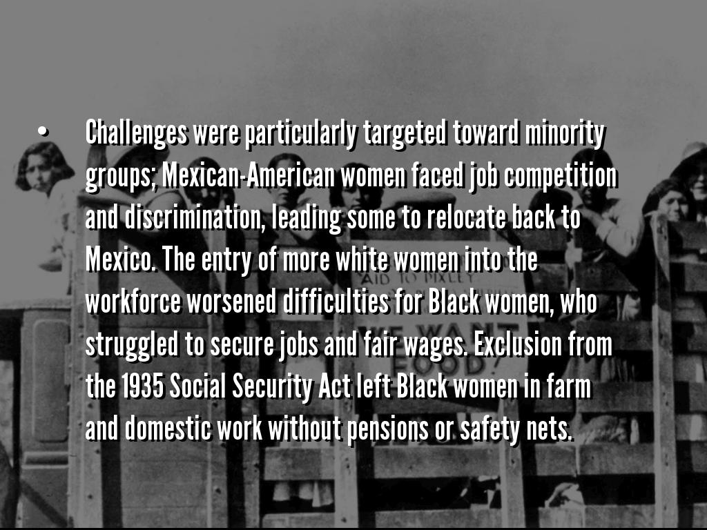 • Challenges were particularly targeted toward minority groups; Mexican-American women faced job competition and discrimination, leading some to relocate back to Mexico. The entry of more white women into the workforce worsened difficulties for Black women, who struggled to secure jobs and fair wages. Exclusion from the 1935 Social Security Act left Black women in farm and domestic work without pensions or safety nets.