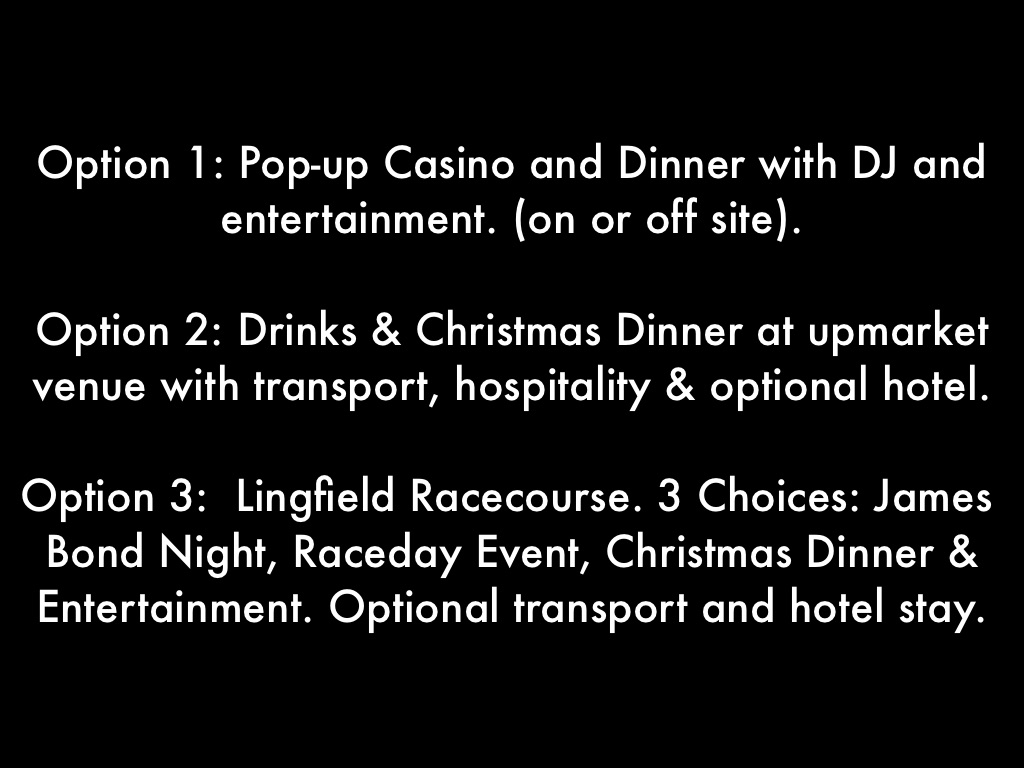 Option 3: Lingfield Racecourse. 3 Choices: James Bond Night, Raceday Event, Christmas Dinner & Entertainment. Optional transport and hotel stay.