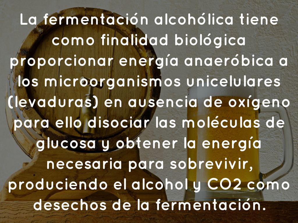 La fermentación alcohólica tiene como finalidad biológica proporcionar energía anaeróbica a los microorganismos unicelulares (levaduras) en ausencia de oxígeno para ello disociar las moléculas de glucosa y obtener la energía necesaria para sobrevivir, produciendo el alcohol y CO2 como desechos de la fermentación.