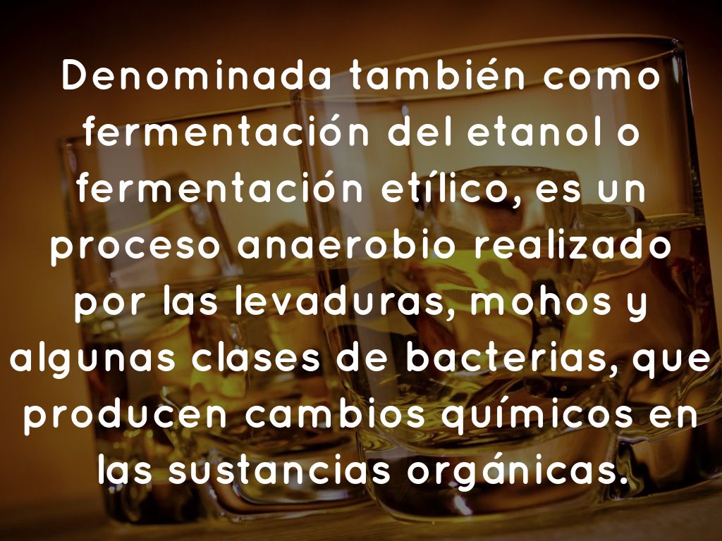 Denominada también como fermentación del etanol o fermentación etílico, es un proceso anaerobio realizado por las levaduras, mohos y algunas clases de bacterias, que producen cambios químicos en las sustancias orgánicas.