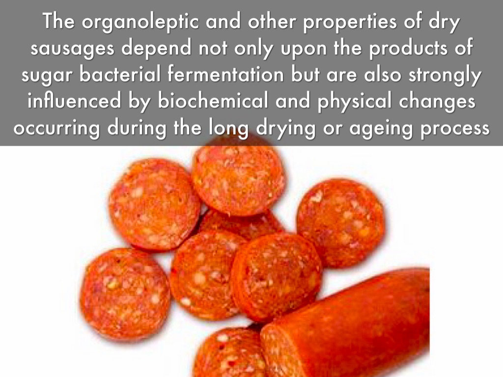 The organoleptic and other properties of dry sausages depend not only upon the products of sugar bacterial fermentation but are also strongly influenced by biochemical and physical changes occurring during the long drying or ageing process