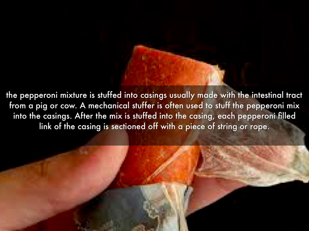 the pepperoni mixture is stuffed into casings usually made with the intestinal tract from a pig or cow. A mechanical stuffer is often used to stuff the pepperoni mix into the casings. After the mix is stuffed into the casing, each pepperoni filled link of the casing is sectioned off with a piece of string or rope.