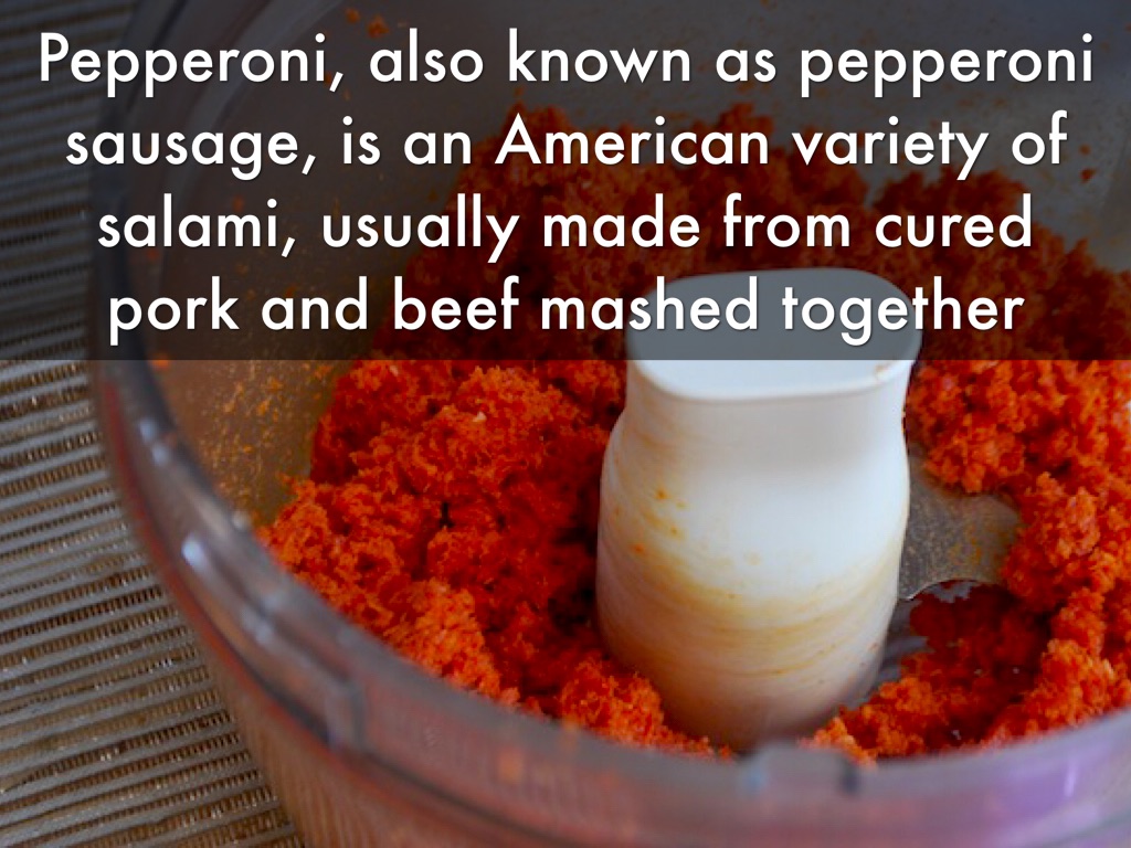 Pepperoni, also known as pepperoni sausage, is an American variety of salami, usually made from cured pork and beef mashed together