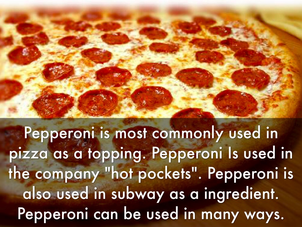 Pepperoni is most commonly used in pizza as a topping. Pepperoni Is used in the company "hot pockets". Pepperoni is also used in subway as a ingredient. Pepperoni can be used in many ways.