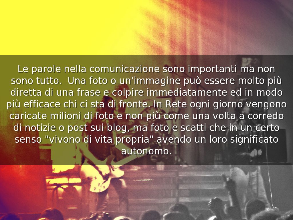 Le parole nella comunicazione sono importanti ma non sono tutto. Una foto o un'immagine può essere molto più diretta di una frase e colpire immediatamente ed in modo più efficace chi ci sta di fronte. In Rete ogni giorno vengono caricate milioni di foto e non più come una volta a corredo di notizie o post sui blog, ma foto e scatti che in un certo senso "vivono di vita propria" avendo un loro significato autonomo.