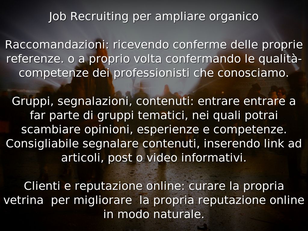 * Raccomandazioni: ricevendo conferme delle proprie referenze o a propria volta Confermando le qualità-competenze dei professionisti che conosciamo.