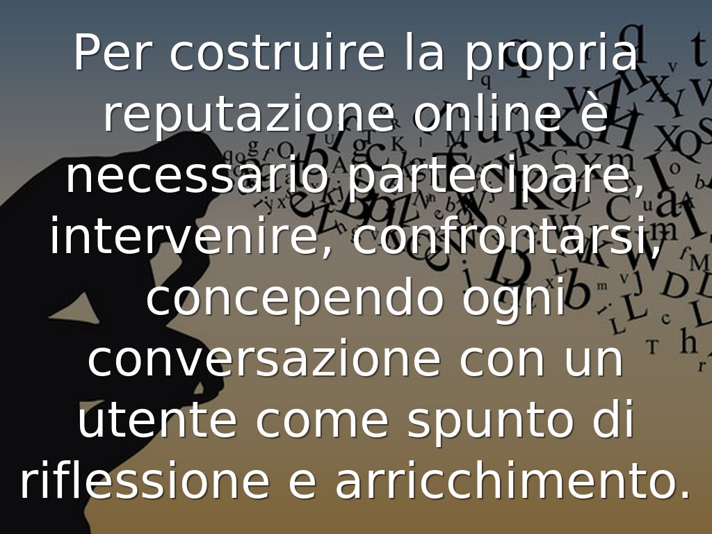 Per costruire la propria reputazione online è necessario partecipare, intervenire, confrontarsi, concependo ogni conversazione con un utente come spunto di riflessione e arricchimento.