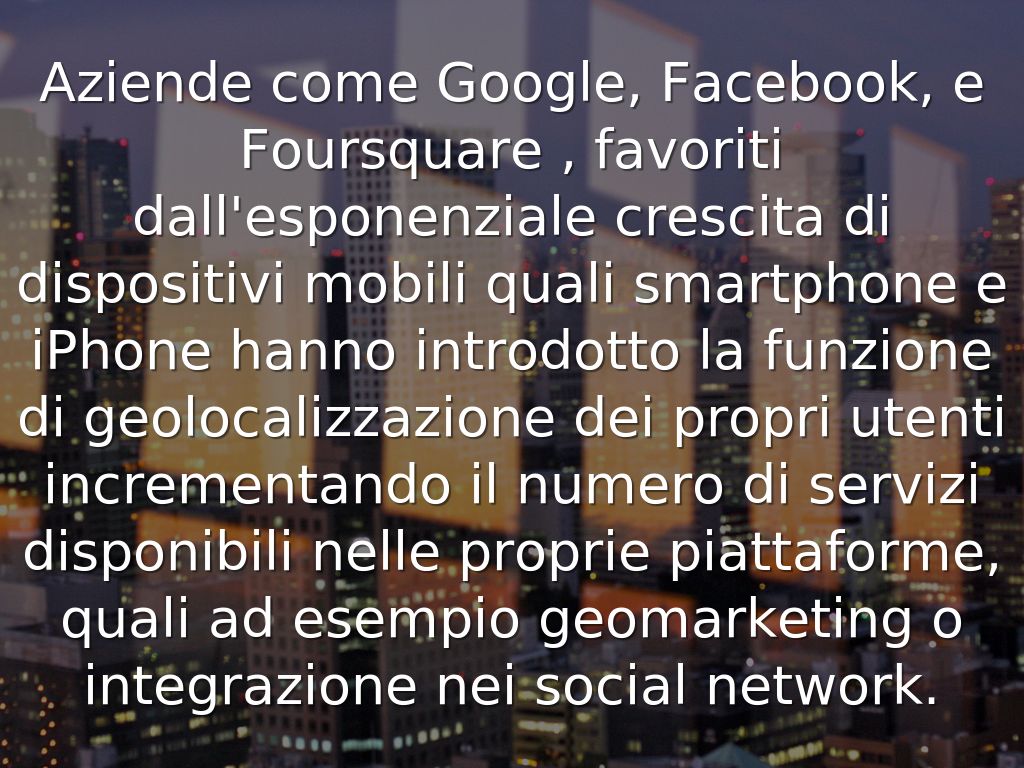 Aziende come Google, Facebook, e Foursquare , favoriti dall'esponenziale crescita di dispositivi mobili quali smartphone e iPhone hanno introdotto la funzione di geolocalizzazione dei propri utenti incrementando il numero di servizi disponibili nelle proprie piattaforme, quali ad esempio geomarketing o integrazione nei social network.