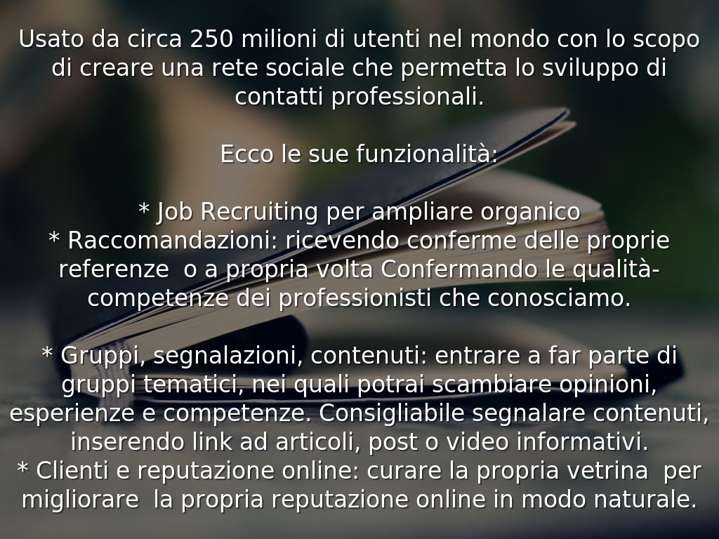 Usato da circa 250 milioni di utenti nel mondo con lo scopo di creare una rete sociale che permetta lo sviluppo di contatti professionali.