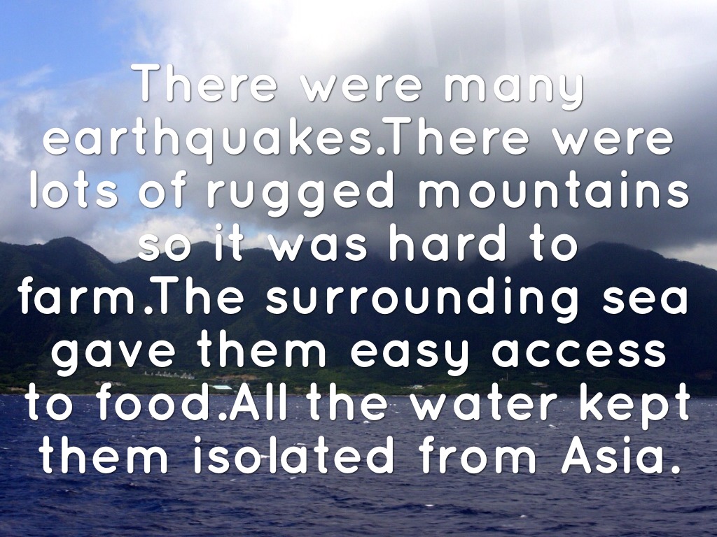 There were many earthquakes.There were lots of rugged mountains so it was hard to farm.The surrounding sea gave them easy access to food.All the water kept them isolated from Asia.