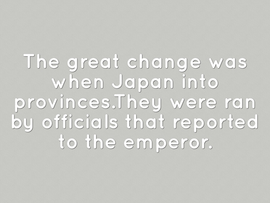 The great change was when Japan into provinces.They were ran by officials that reported to the emperor.