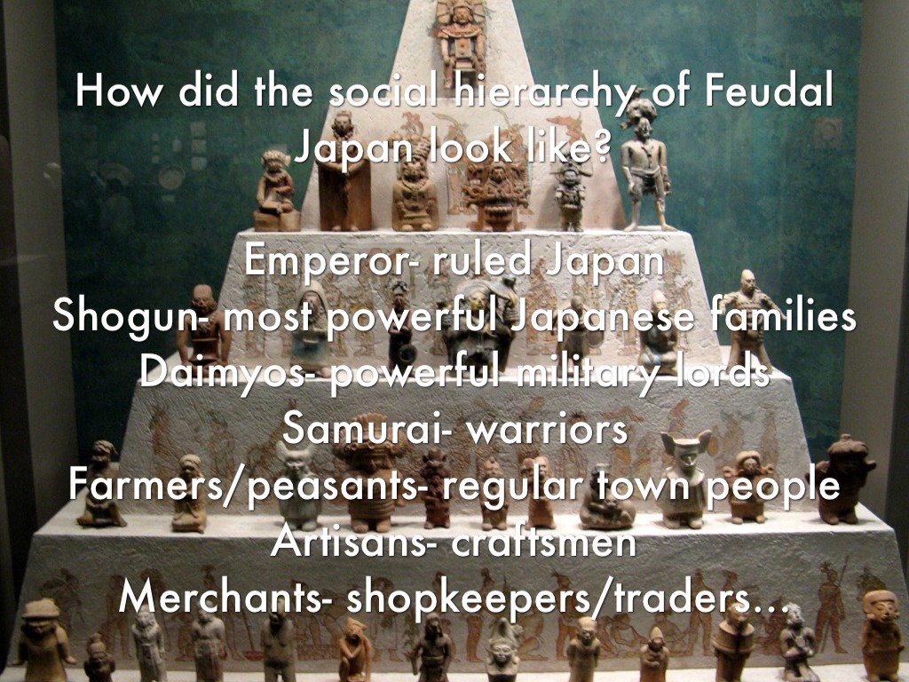 Emperor- ruled Japan Shogun- most powerful Japanese families Daimyos- powerful military lords Samurai- warriors Farmers/peasants- regular town people Artisans- craftsmen Merchants- shopkeepers/traders…