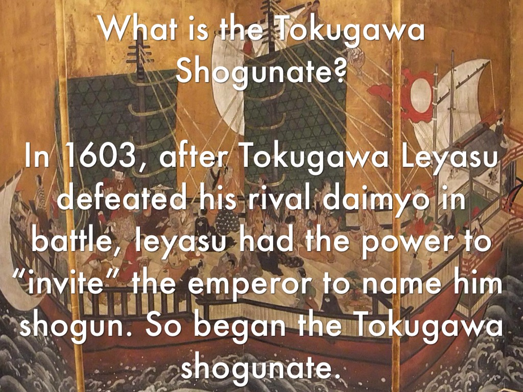 In 1603, after Tokugawa Leyasu defeated his rival daimyo in battle, Ieyasu had the power to “invite” the emperor to name him shogun. So began the Tokugawa shogunate.