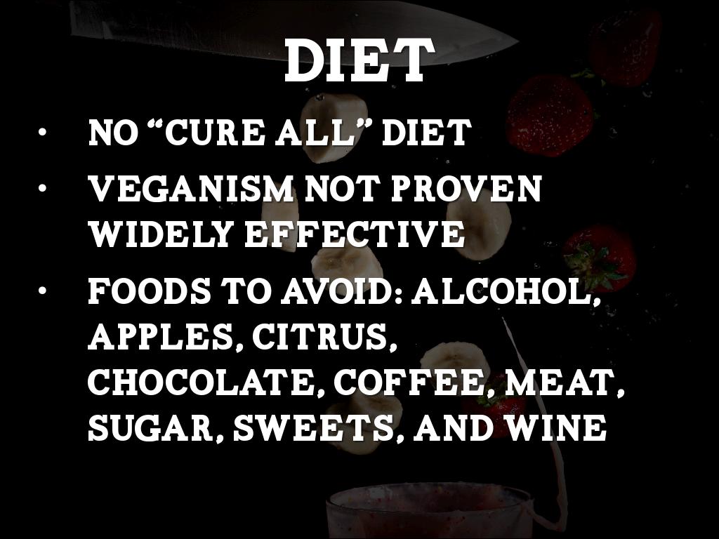 Foods to Avoid: alcohol, apples, citrus, chocolate, coffee, meat, sugar, sweets, and wine