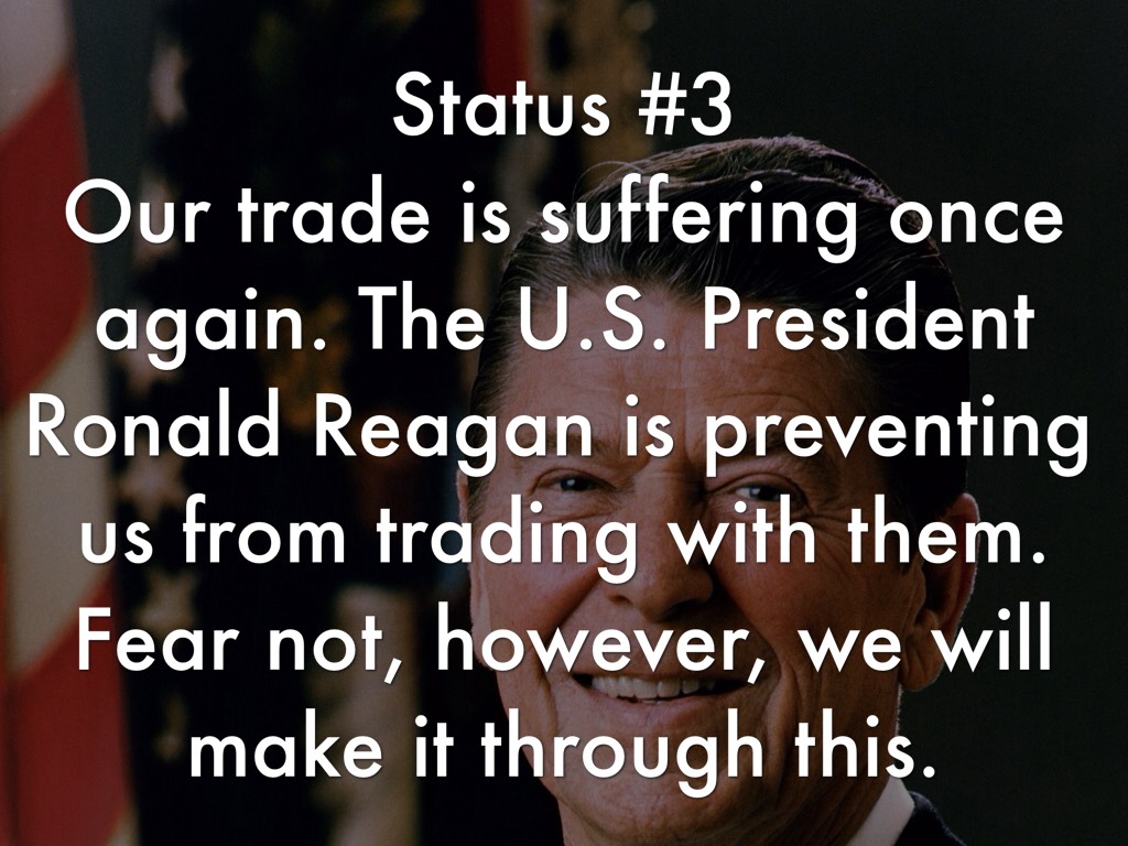 Our trade is suffering once again. The U.S. President Ronald Reagan is preventing us from trading with them. Fear not, however, we will make it through this.