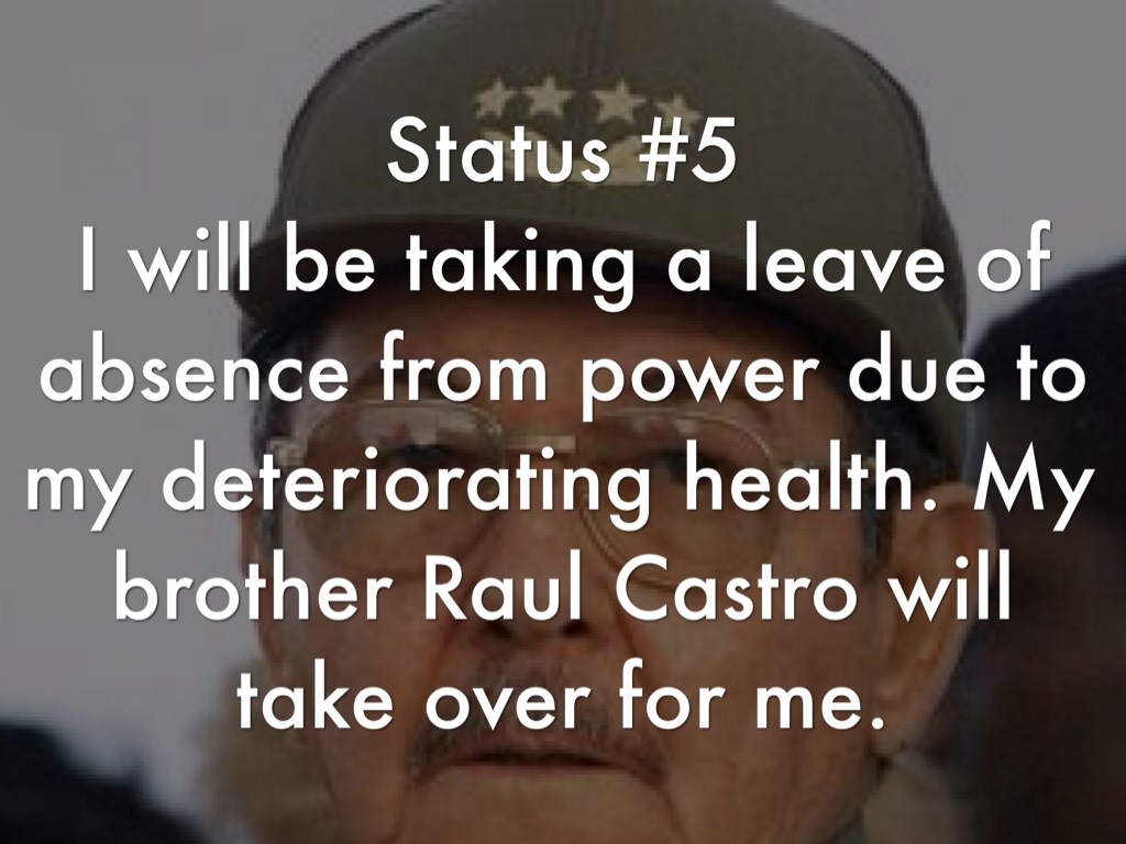 I will be taking a leave of absence from power due to my deteriorating health. My brother Raul Castro will take over for me.