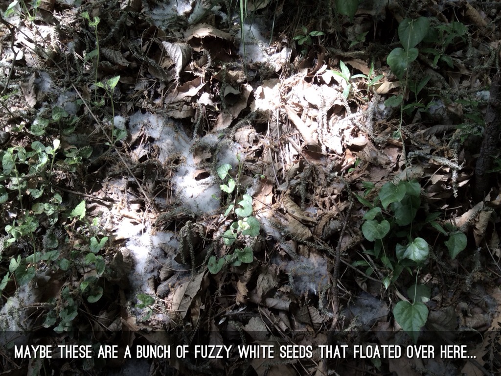 MAYBE THESE ARE A BUNCH OF FUZZY WHITE SEEDS THAT FLOATED OVER HERE...