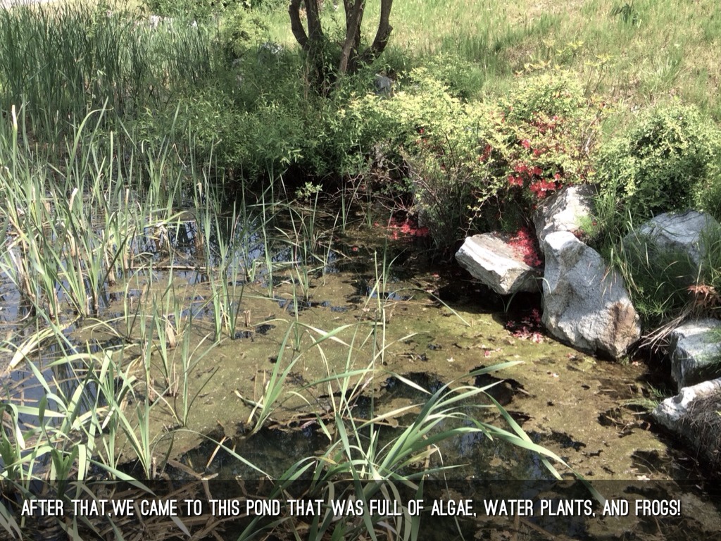 AFTER THAT,WE CAME TO THIS POND THAT WAS FULL OF ALGAE, WATER PLANTS, AND FROGS!