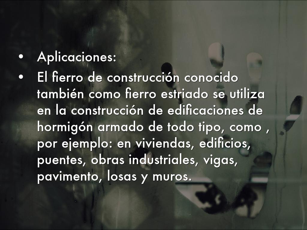 El fierro de construcción conocido también como fierro estriado se utiliza en la construcción de edificaciones de hormigón armado de todo tipo, como , por ejemplo: en viviendas, edificios, puentes, obras industriales, vigas, pavimento, losas y muros.