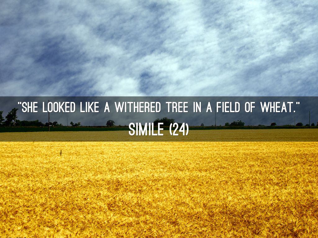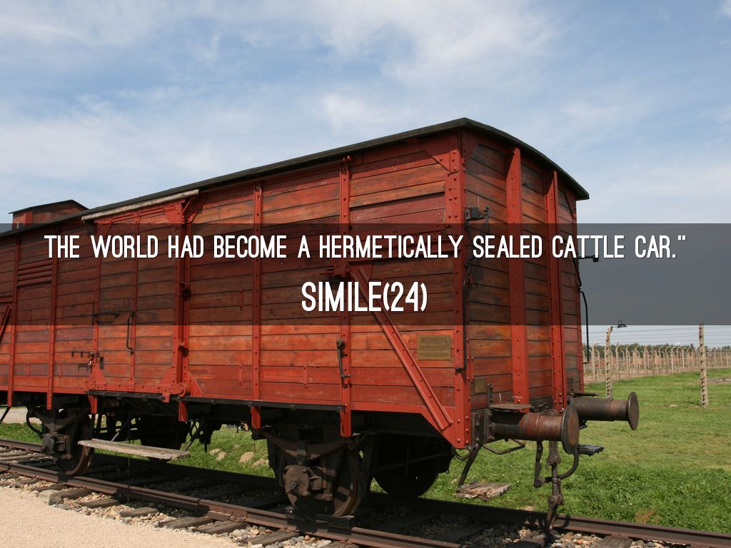 “The shadows around me roused themselves as if from a deep sleep and left silently in every direction.” 14 "The world was a cattle wagon hermetically sealed."(22)metaphordogs." (24)simile“The shadows around me roused themselves as if from a deep sleep and left silently in every direction.” 14