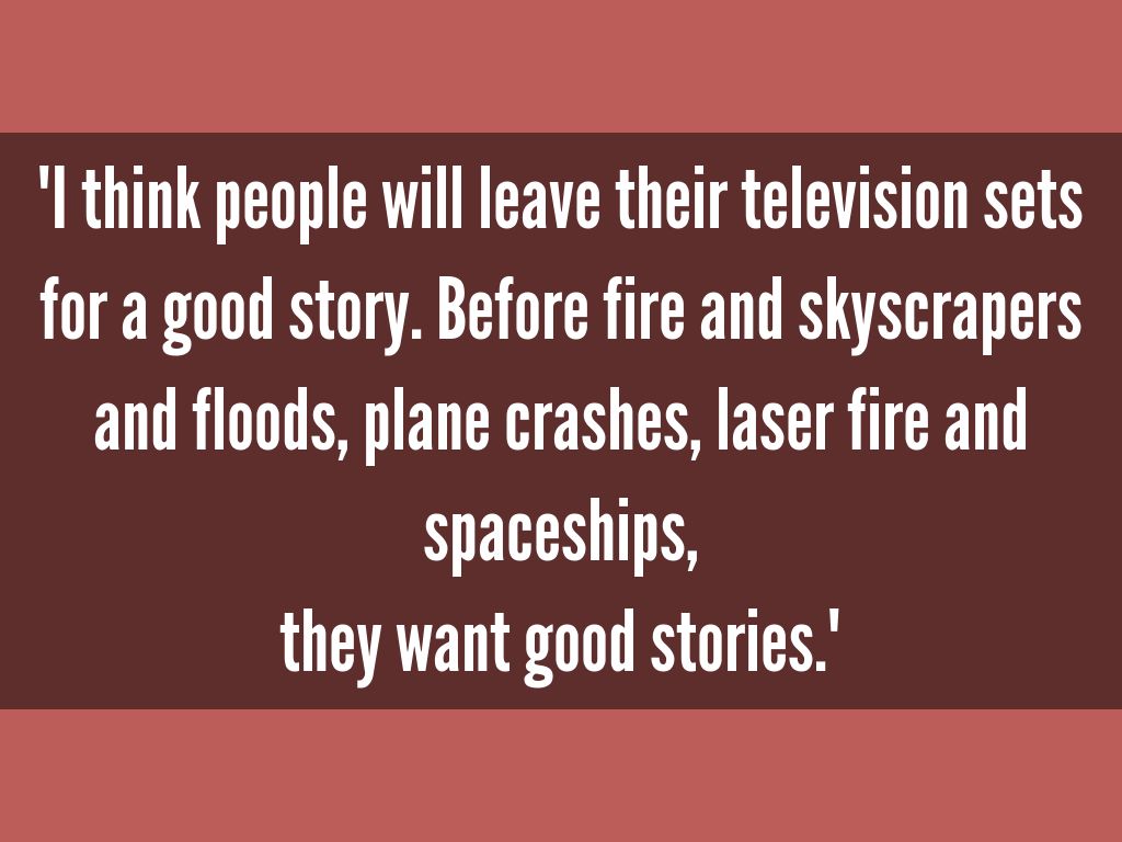 "I think people will leave their television sets for a good story. Before fire and skyscrapers and floods, plane crashes, laser fire and spaceships,